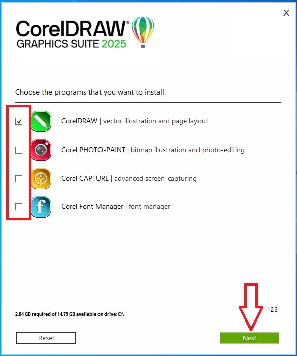 + Bước 7: Nếu chỉ xài corel 2025 thì tích vào “CorelDRAW“, hoặc cài phần mềm đi kèm nào thì tích thêm bên dưới.